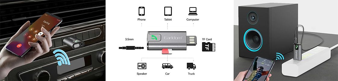 — універсальна сумісність: працює з телефонами, планшетами та комп'ютерами. Під'єднується до динаміків, автомобілів і вантажівок через роз'єм 3,5 мм. Підтримує відтворення і зберігання карт TF.