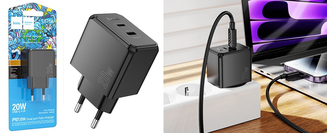 Мережевий Зарядний Пристрій Hoco CS16A 1Lightning + 1Type-C/20W/PD (Чорний)